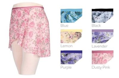 Floral printed chiffon wrap skirt. An elegant skirt to pair with our leotard selection.